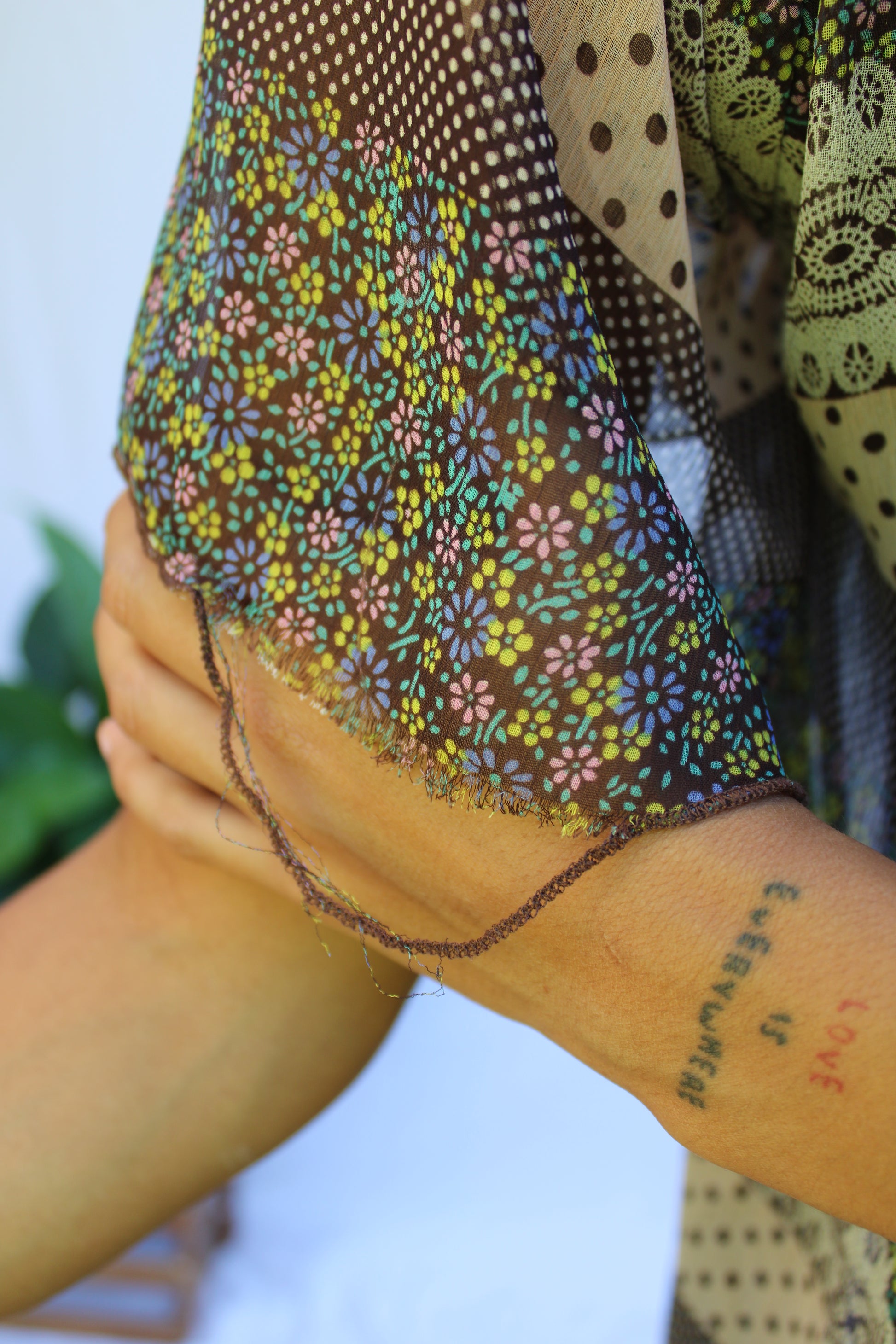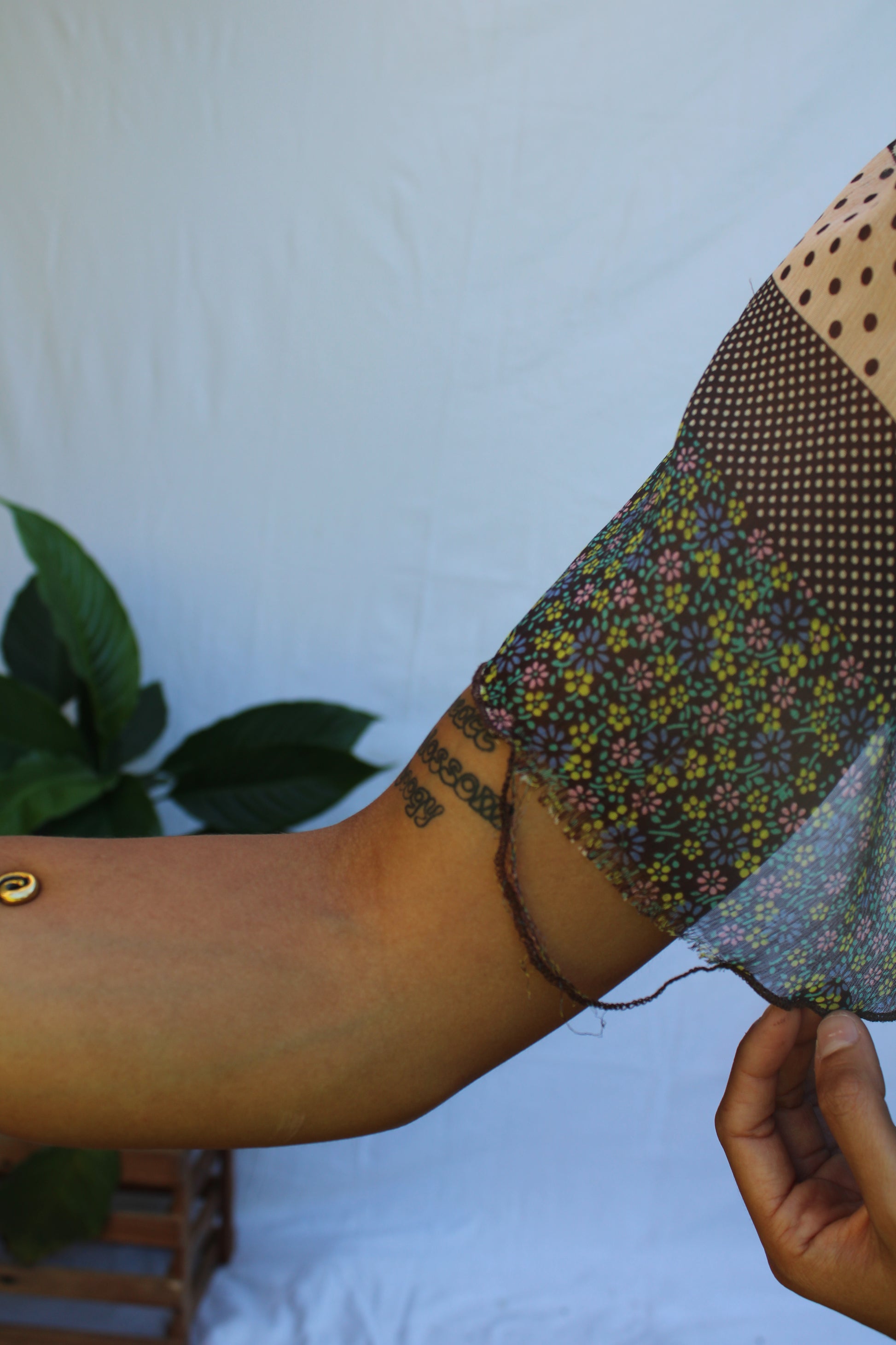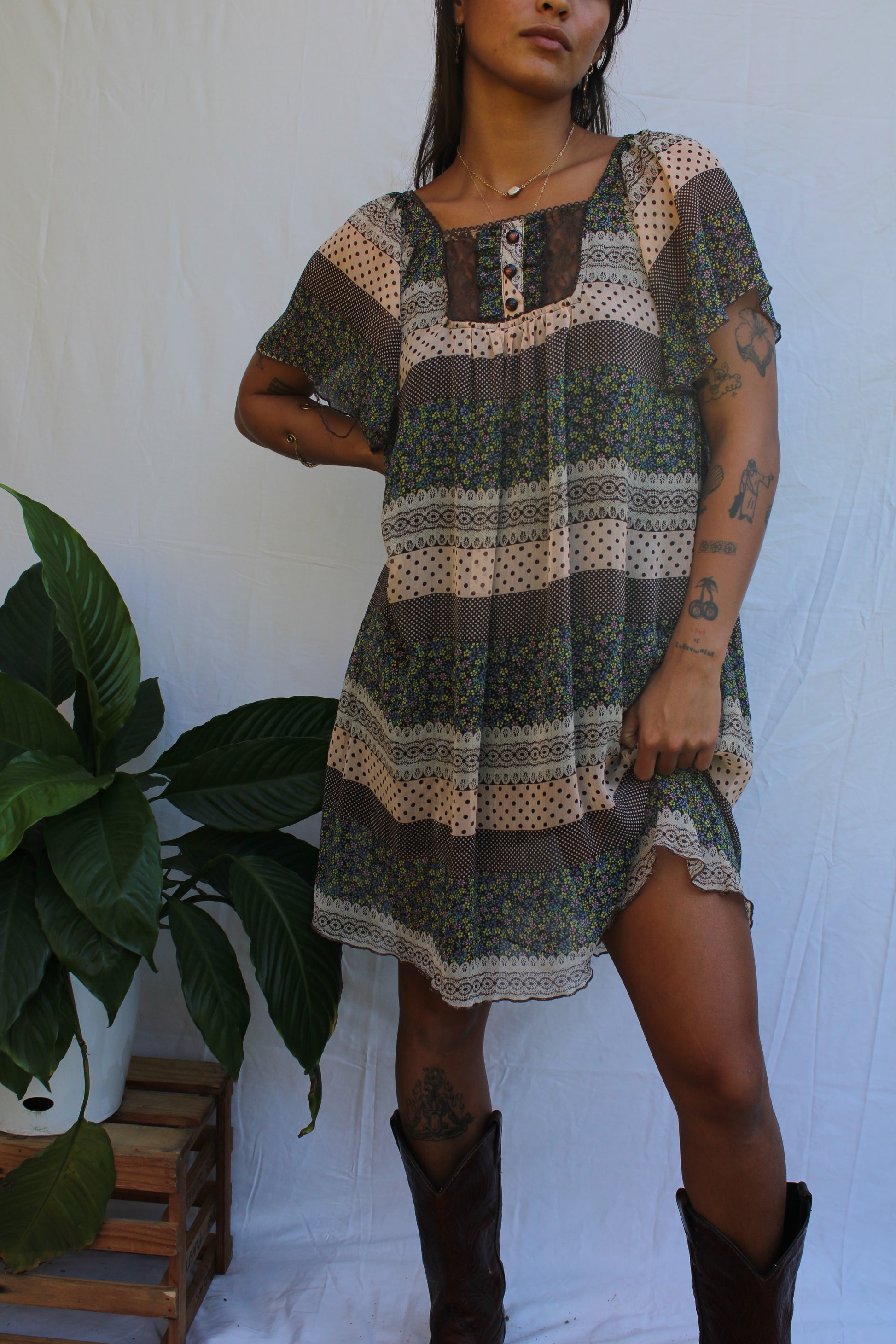 A romantic, free spirited piece with vintage soul and playful charm. Leightweight semi-sheer chiffon with an all-over patchwork mix of ditsy florals, delicate lace print, polka dots and geometric bands in earthy tones of taupe, blush, olive and deep brown. Sheer lace panel chest with tiny fabric-covered buttons for a sweet, handcrafted touch. This relaxed mini length dress has a square neckline framed by soft flutter sleeves and falls to sit mid-thigh.