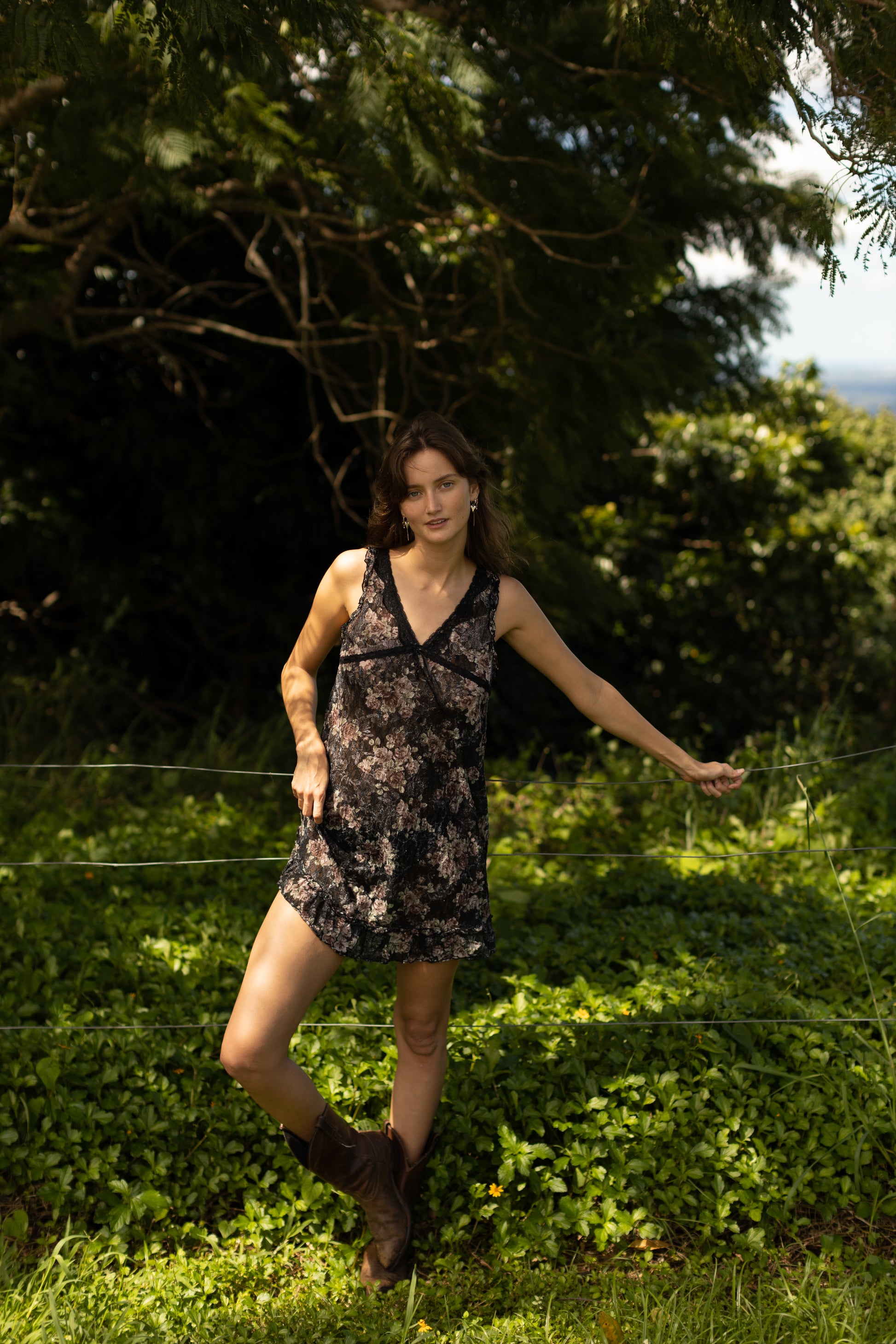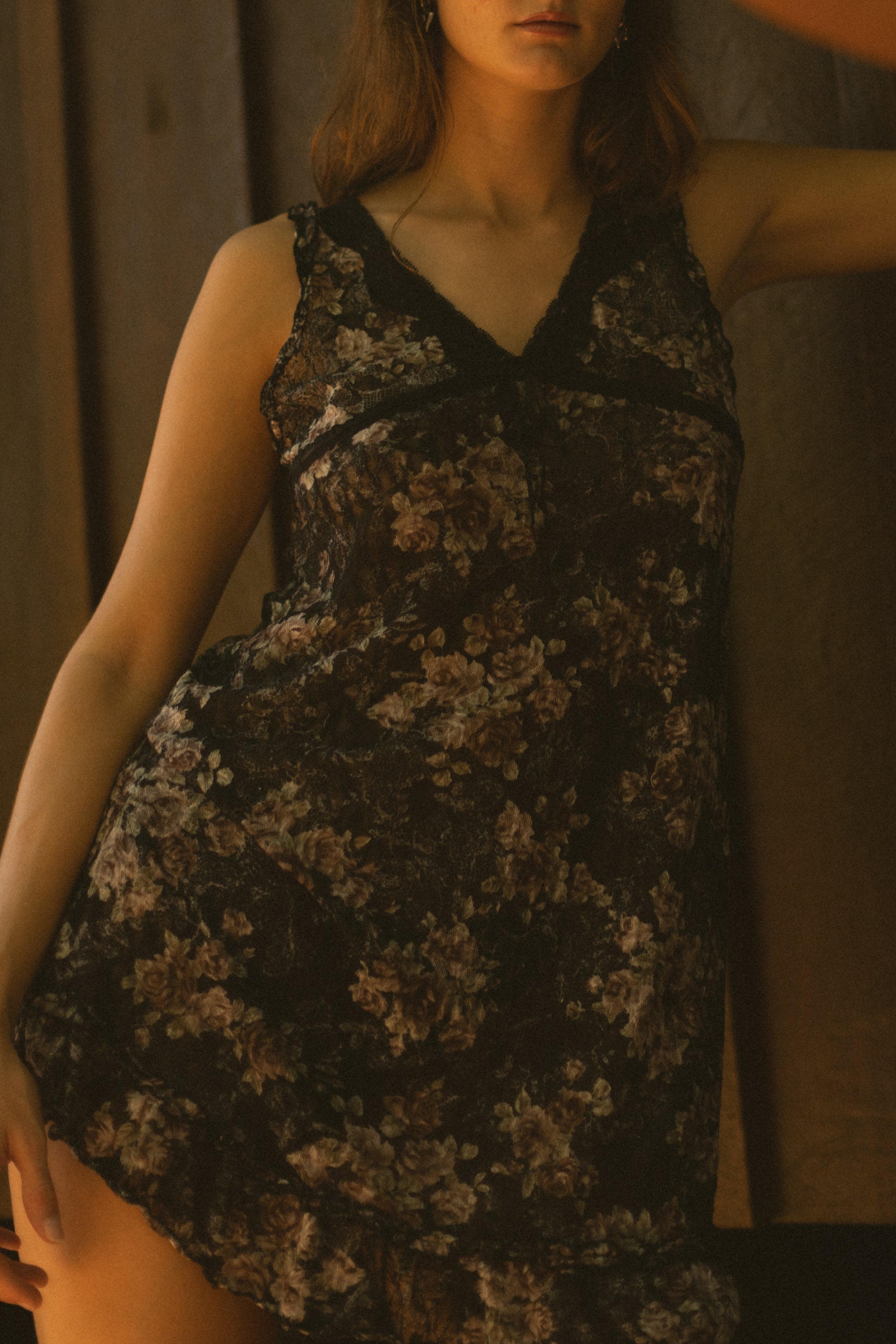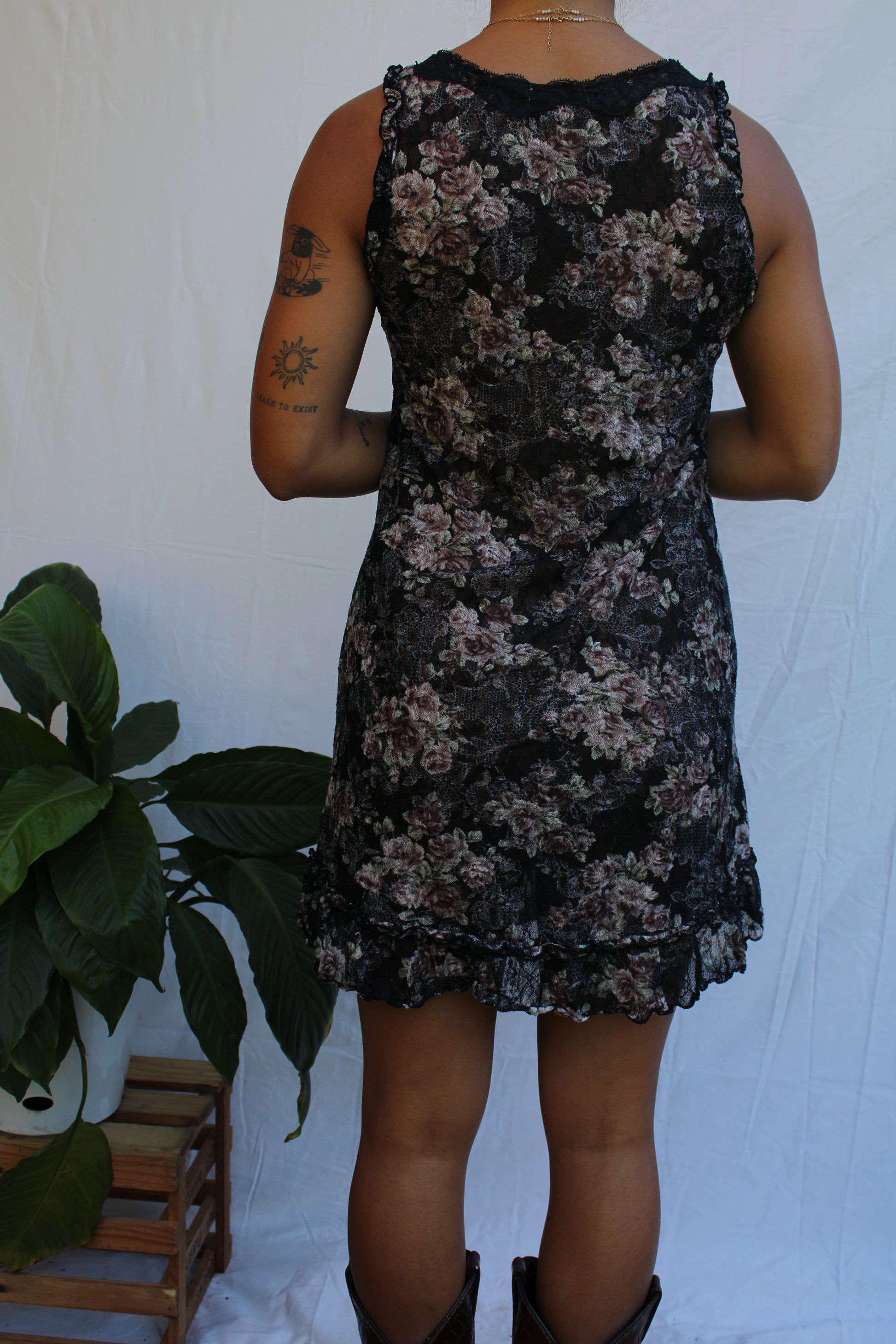 Step into romantic, moody elegance with this stunning black floral mini dress. This piece features a delicate black lace overlay with soft mauve, blush and cream floral patterns, giving it a vintage lingerie feel. A flattering V-necklice trimmed with lace, adding texture and a touch of feminine allure. Sleeveless design with small shoulder ruffles for extra charm. A lightweight, slightly sheer fabric with soft stretch, making it easy and comfortable to wear. Ruffled hem for a playful, flirty finish.