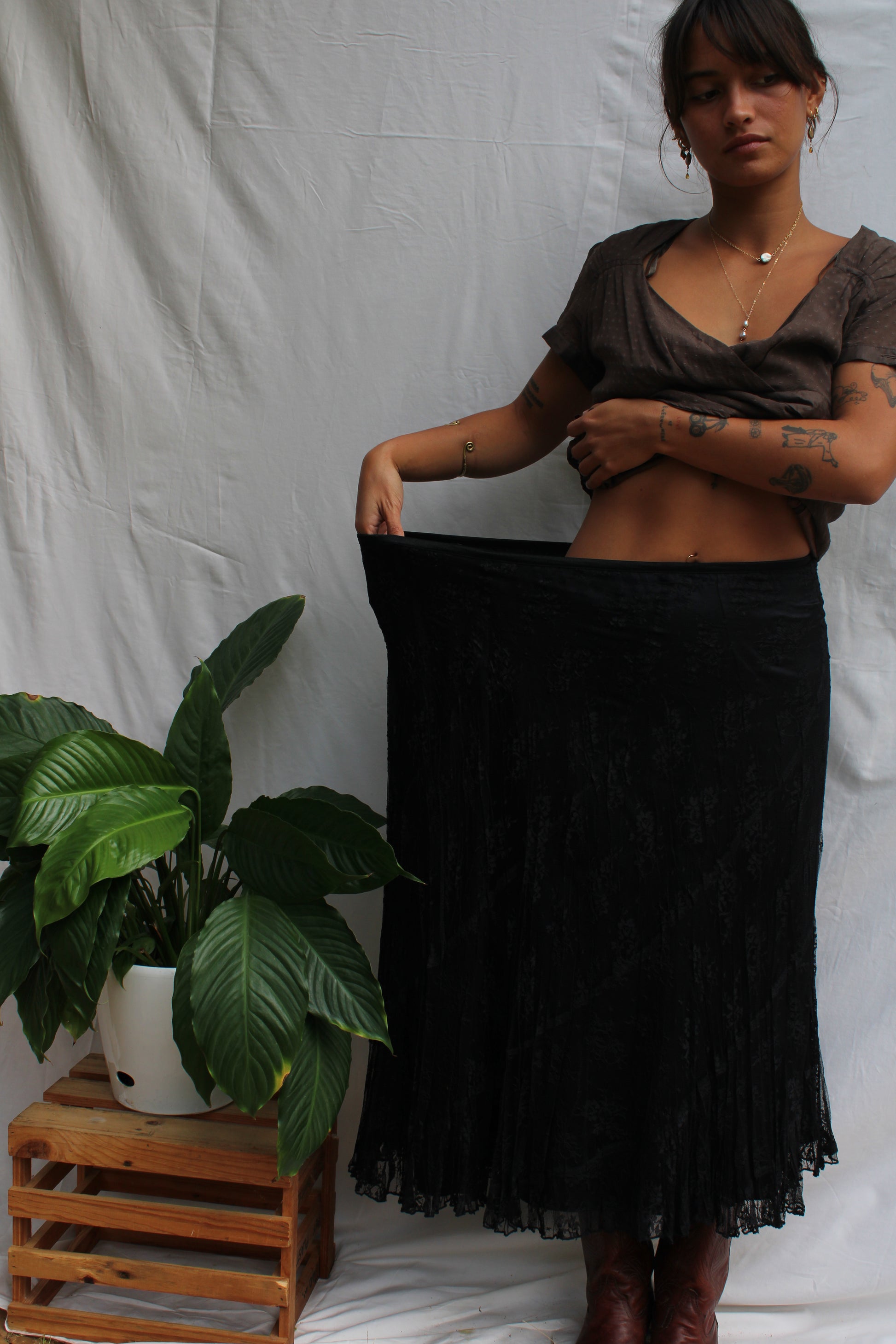 This vintage black maxi skirt is a dreamy blend of romance and texture, featuring delicate sheer lace layered over a solid black lining. Sheer black lace overlay with subtle floral pattern. Lots of movement, while the flexible waistband ensures a smooth, flattering fit. This skirt adds timeless elegance to any outfit.