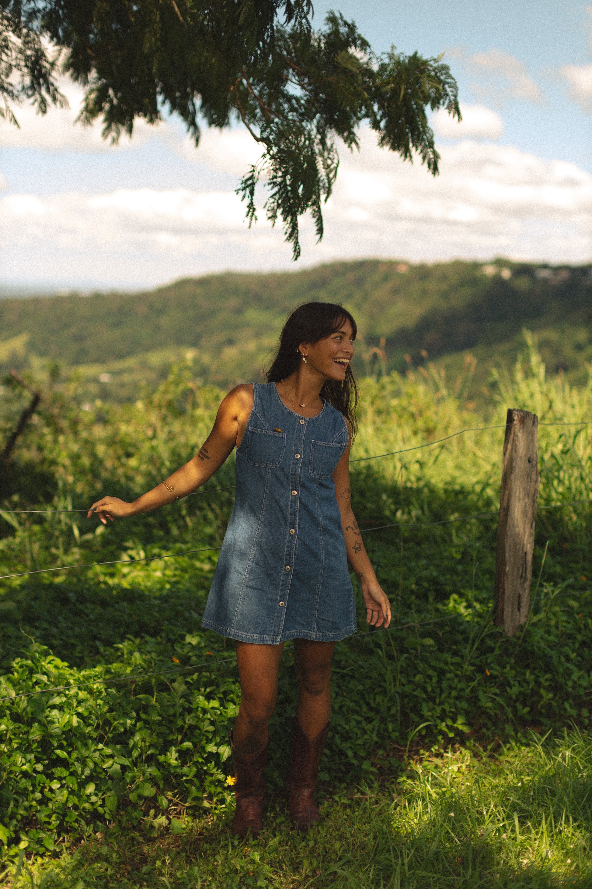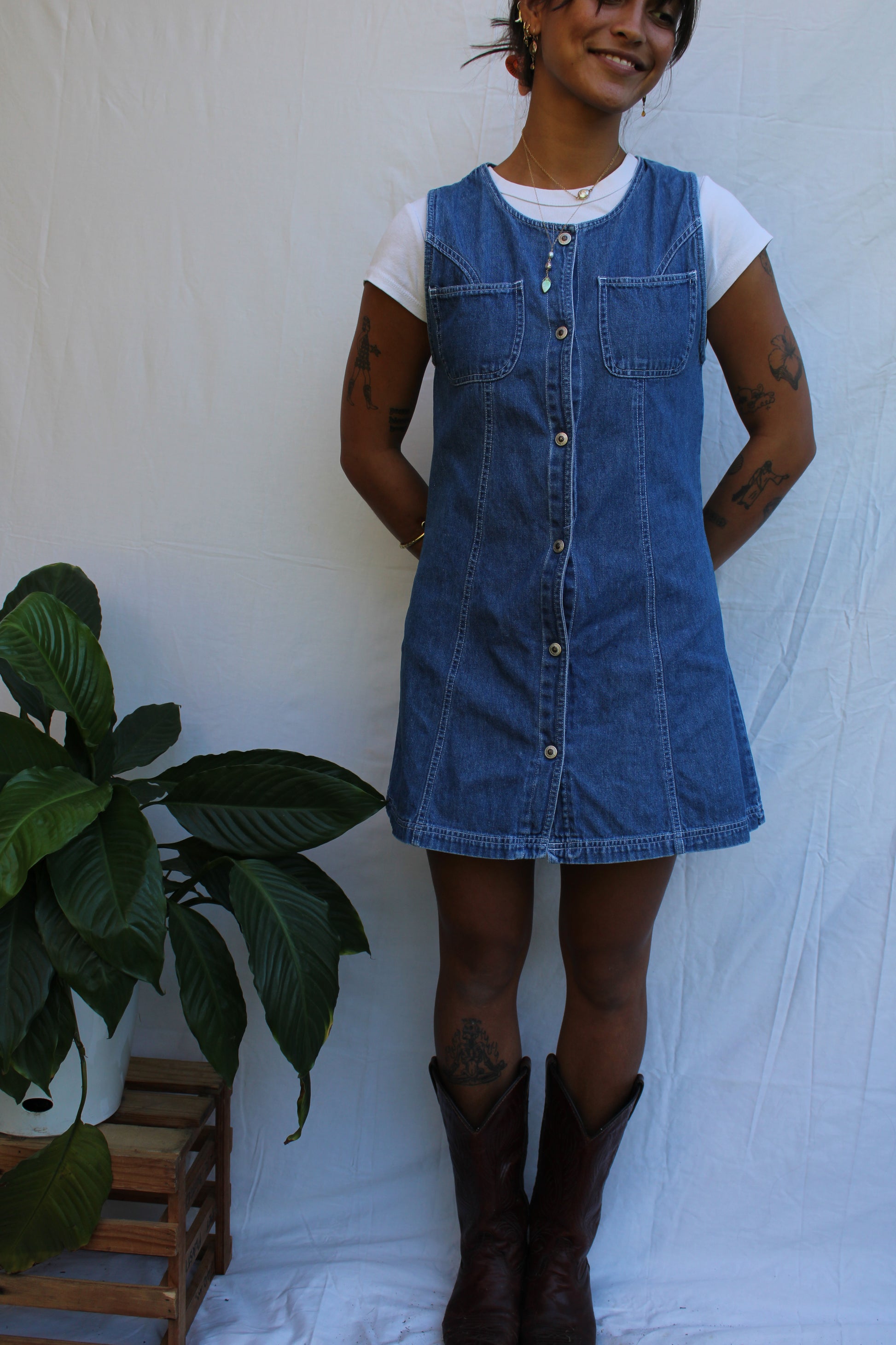This adorable sleeveless denim mini dress brings a perfect casual, retro charm. Crafted from medium-wash denim with a lightweight feel to be layered easily. Structured but soft against the skin to flatter the figure without clinging too tightly. Button-front closure with metal-look buttons all the way down. Buttons are clip up making it super easy to put on and take off. Two front chest pockets for a touch of utility style. Panel stitching along the front and back for a flattering, slightly tailored fit. Slightly flared hem for easy movement and a feminine touch. The perfect staple.