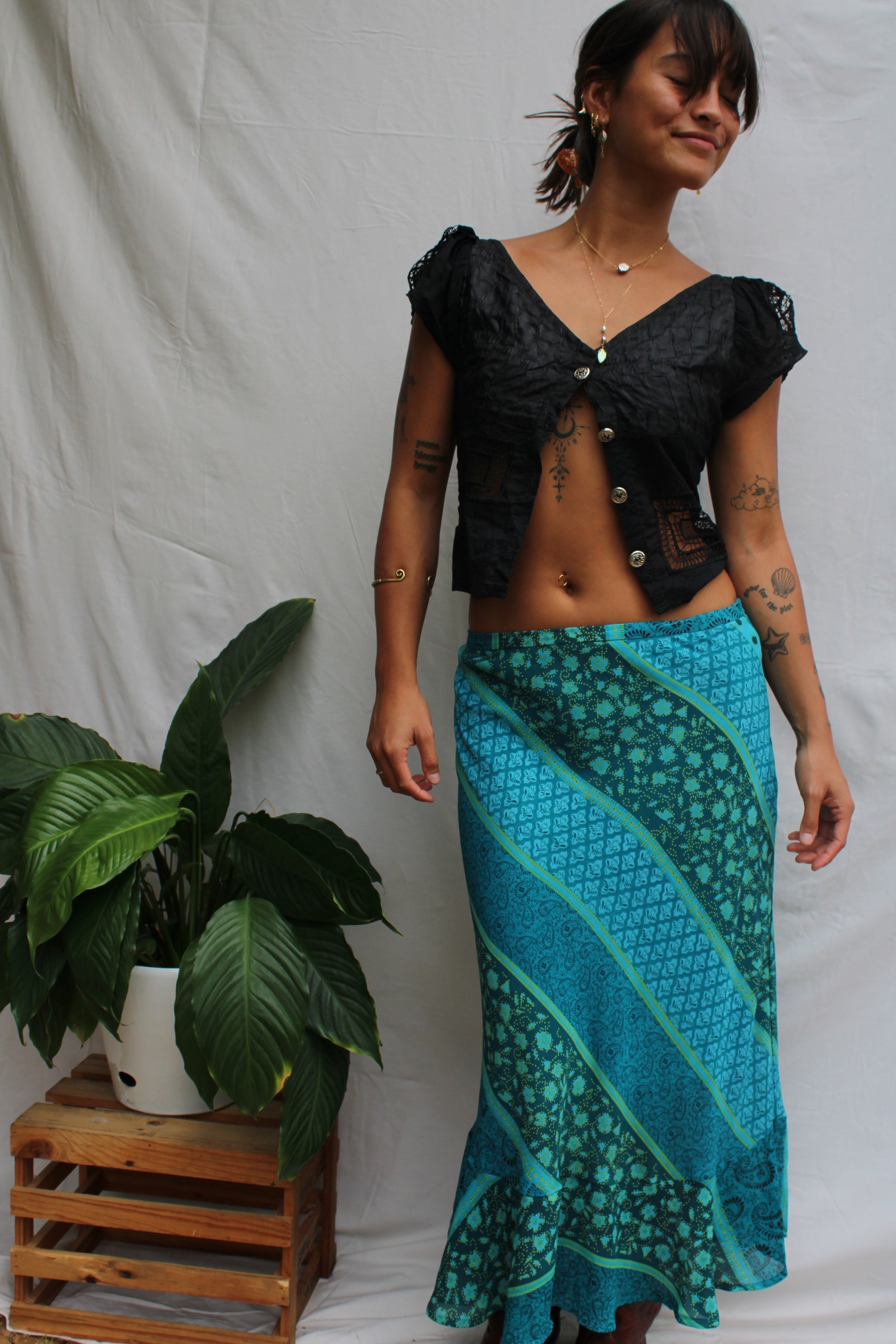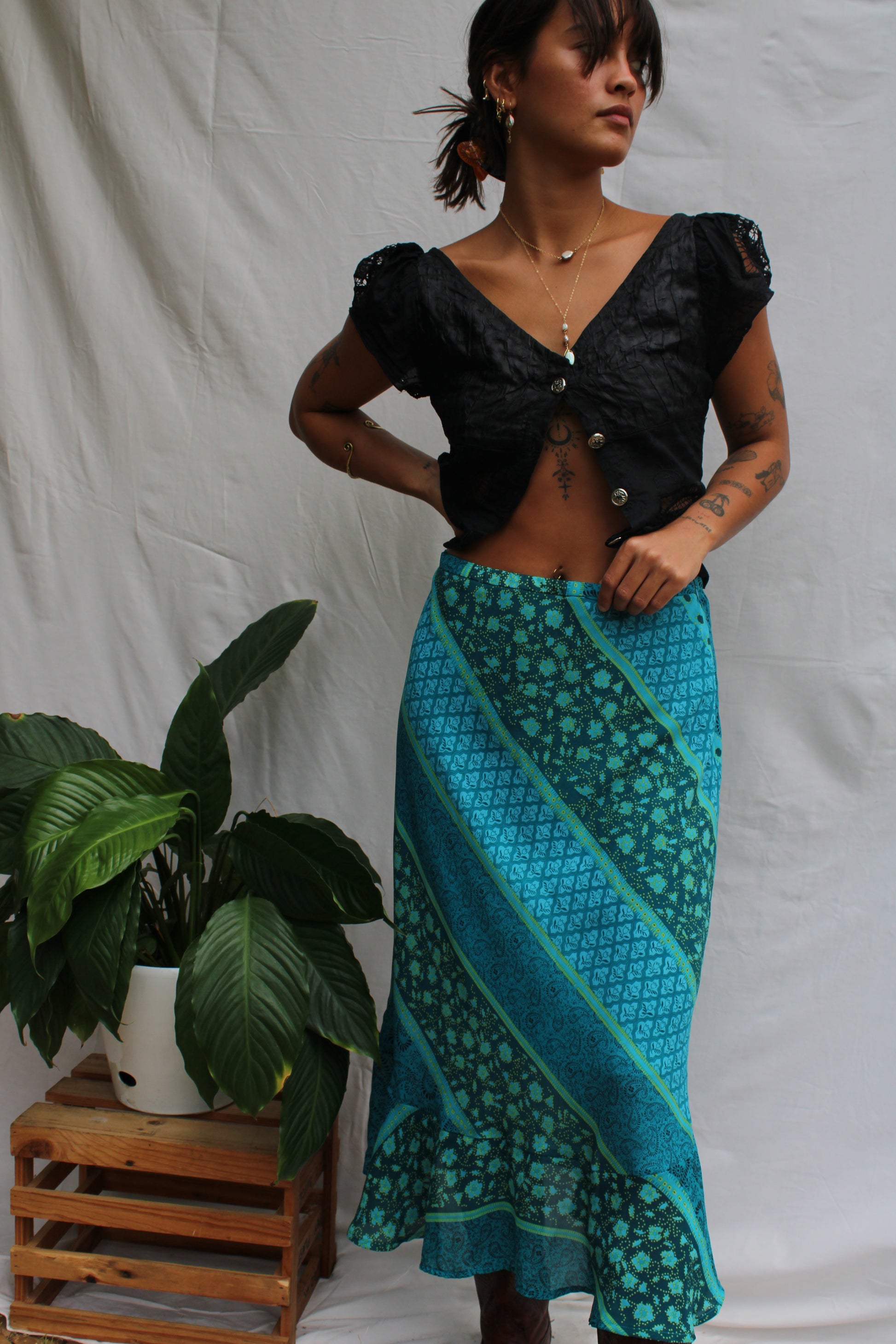 This stunning bias-cut maxi skirt features a vivid mix of turquoise, teal, and green patchwork-style floral and geometric prints. It has a subtle fishtail hem with a delicate ruffle, giving it soft, flowy movement. The side features a partial zipper for ease. Airy, soft, and slightly silky to the touch — perfect for a breezy bohemian vibe.