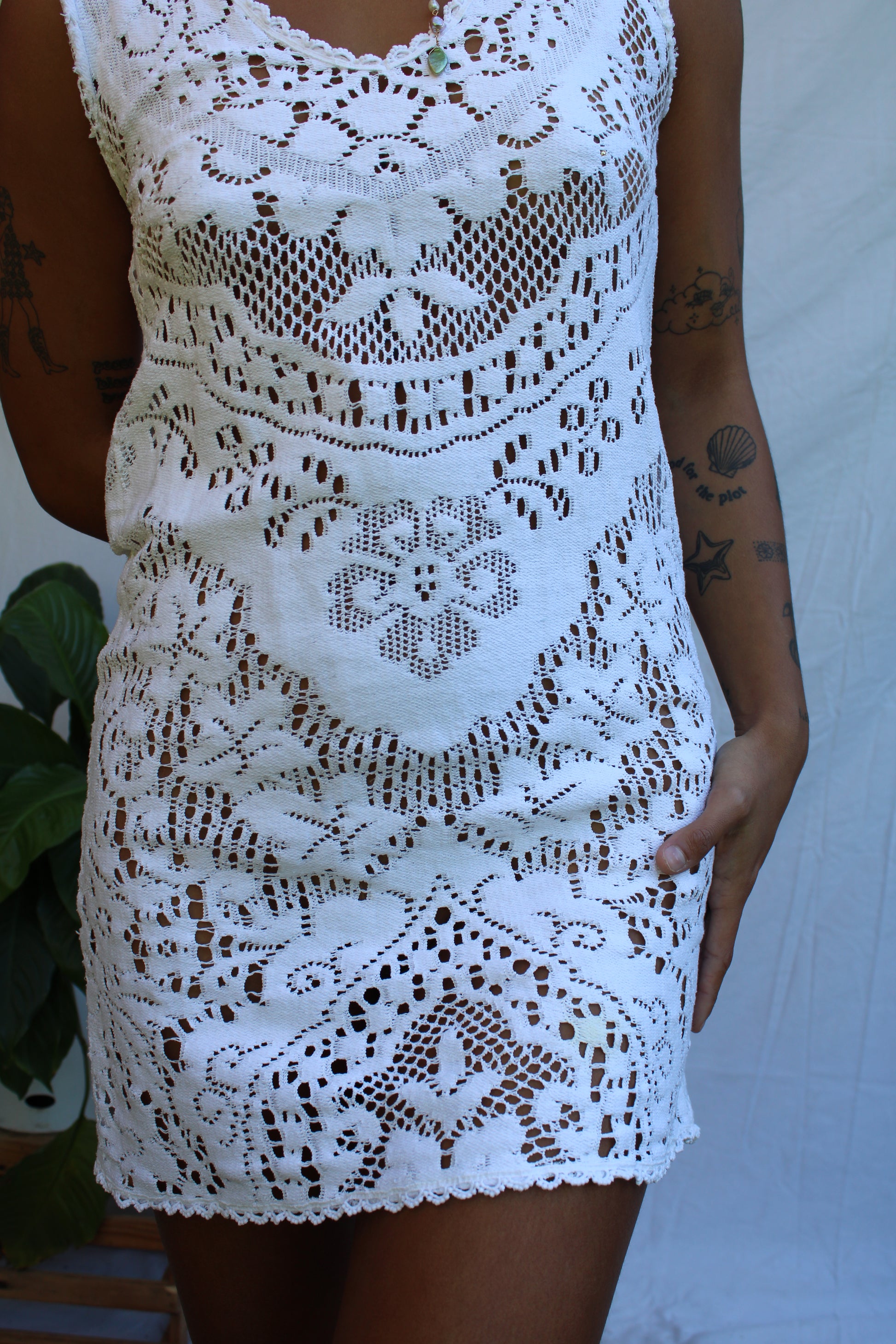 Step into delicate, boho charm with this gorgeous vintage white crochet mini dress. This sleeveless piece features a V-neckline and a fitted silhouette, crafted entirely from an intricate, openwork crochet lace that creates a stunning floral and geometric pattern throughout. The dress hugs the body softly and has a slightly stretchy, form-skimming feel. Mini length, sleeveless, pullover design with no zipper. Great vintage condition.